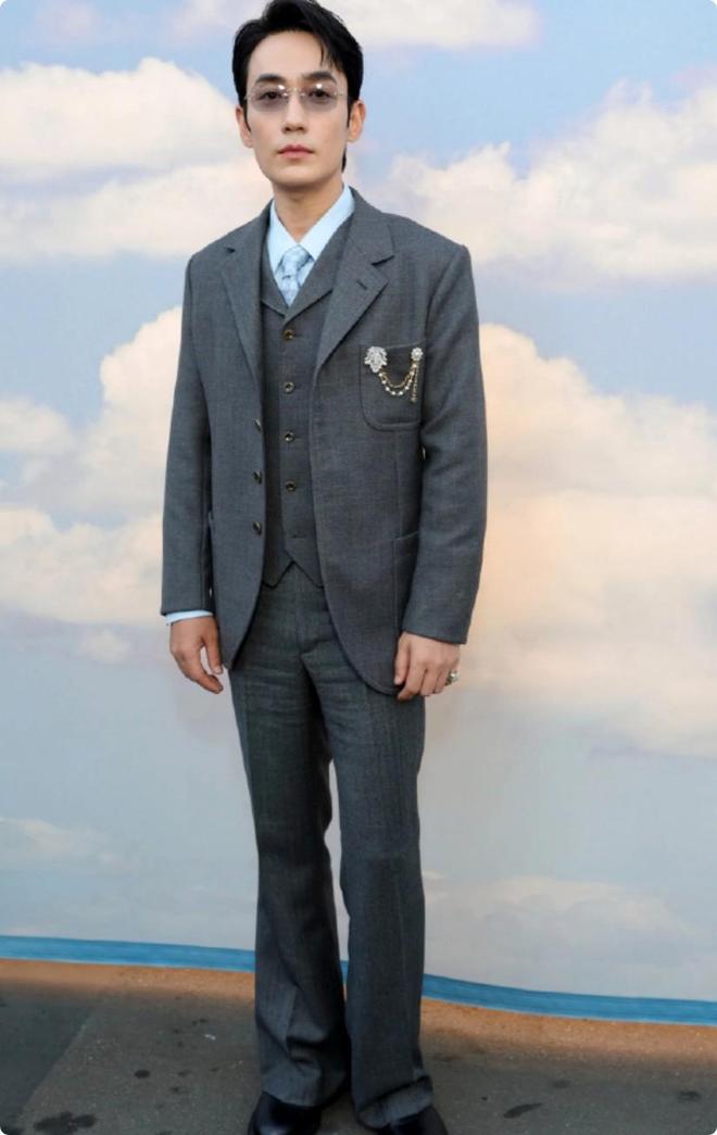 他走的是典型的“老钱风”路线,灰色三件套西服、挺括剪裁、干净线条,绅士味十足。